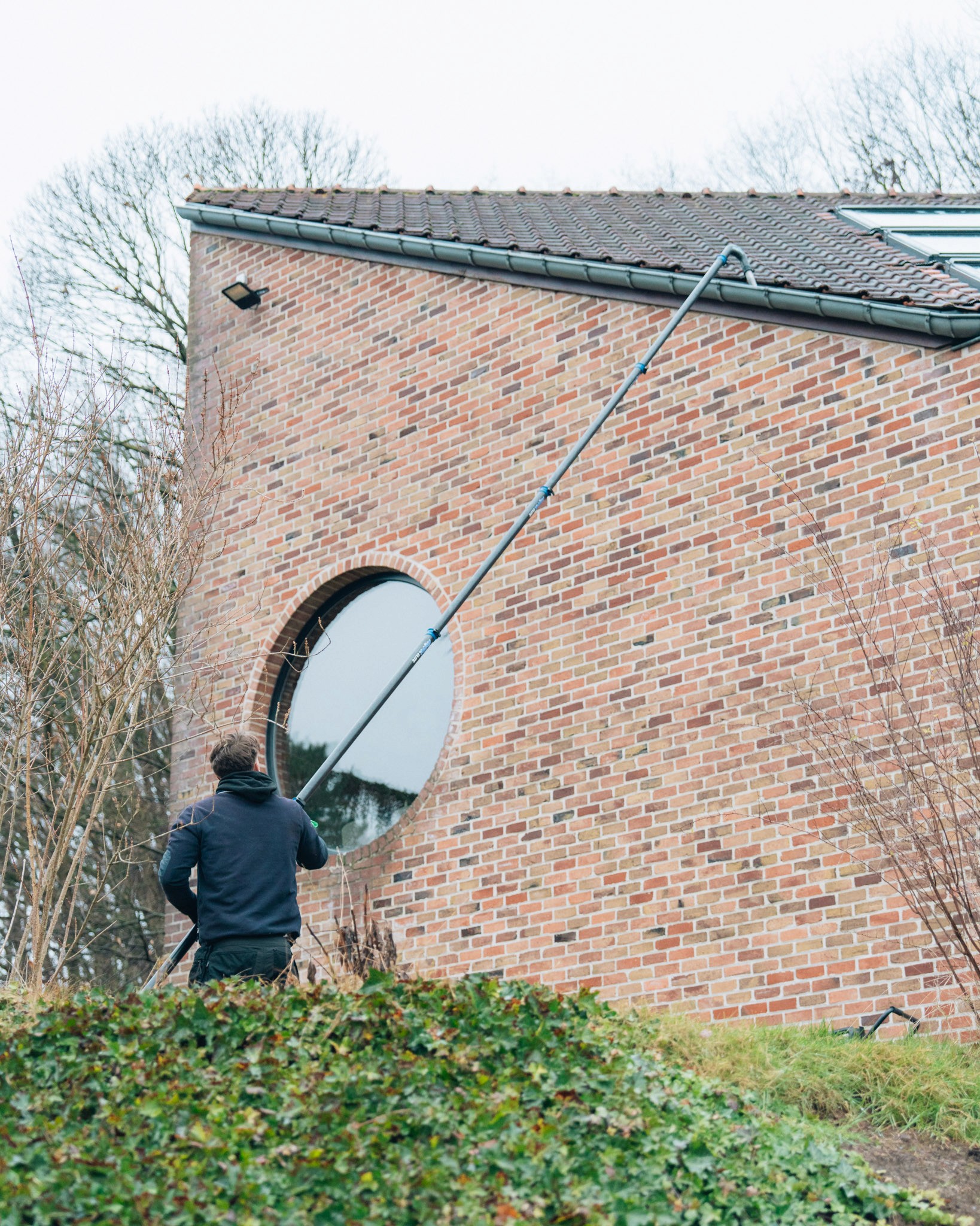 We werken met een industriële stofzuiger op telescopische stelen. Dat is een redelijk unieke methode in België. We bereiken dakgoten tot 12 meter hoogte zonder ladder of hoogtewerker. Na het uitzuigen controleren we met een camera of alles vrij is. Zo zien we ook of er scheuren, doorhangende stukken of andere problemen zijn.